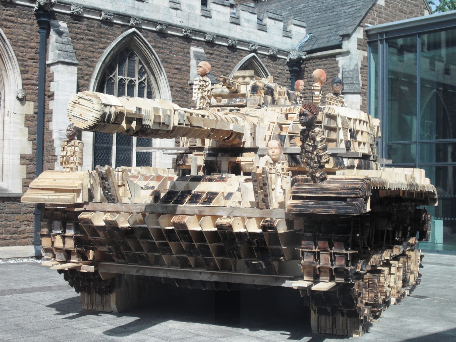 I took a load of hedge cuttings to the tip this morning, then onto town to pick up a few things. I dropped in at the Arts Centre to see a new exhibition, and found a chuffin great tank in the courtyard. Sculptor Peter Mountain has created a life size US army tank working from data downloaded from a website that supplies virtual objects for the computer games industry. It took him three years to make this entirely from wood, and it took two people a week  to construct it here. It came in flat packs on the back of a lorry. A bit more complex than Ikea, I think, ha ha. It's really amazing. I couldn't get close to it as it is not quite finished and Peter Mountain doesn't want close up photo's taken until he has added the missing parts.