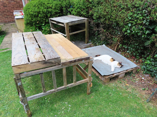 Good morning. The refurbishment of a collapsed table. It stands over a pallet covered with a piece of heavy duty floor covering. Mayze is a bit miffed that I have destroyed her shelter.