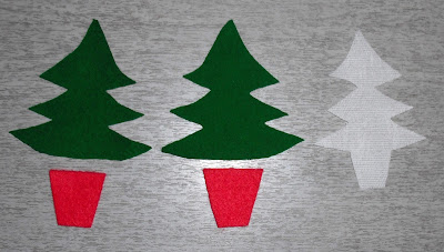 Here are the pieces I cut out of green and red felt, with a white piece of stiffener to put in the middle. This is a trial to see how it works out. It was a bit fiddly to sew the tree onto the tubs, what I should have done was to give the tree a trunk to fit inside the tub. I will do that next time. The green felt is from a snooker table which was recovered. It's stronger and thicker than normal felt.