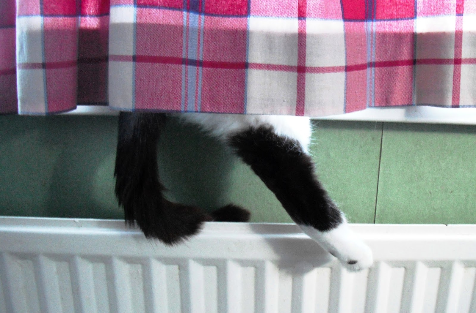 Hello. The lady who took two of Heidi's kittens sends Janet update photo's of how they are getting on. They absolutely adore Archie and Alfie, and the cats absolutely adore each other. Here they are snoozing on the shelf above the radiator. Now where have I seen a cat dangling it's back leg and tail over the edge before?
